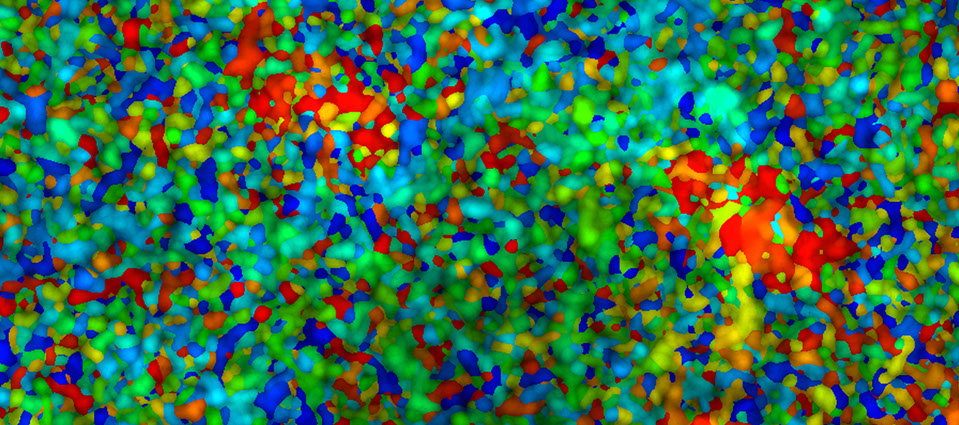 Researchers would like to better understand how a part of the bone that’s known as collagen grows. This view of a human thigh bone, which was re-created with three-dimensional computer imaging software, shows typical collagen growth patterns in 3D. The red, yellow, blue and green areas represent different growth patterns.
