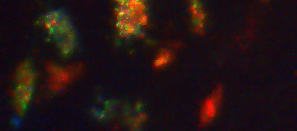 A close-up view of the bone of a cave bear who lived between 400,000 and 700,000 years ago in Spain. This microscopic image shows specific features of the skeletal remains of bears that were found with humans in the same caves. The red and blue colors highlight three-dimensional locations of features in the bone.