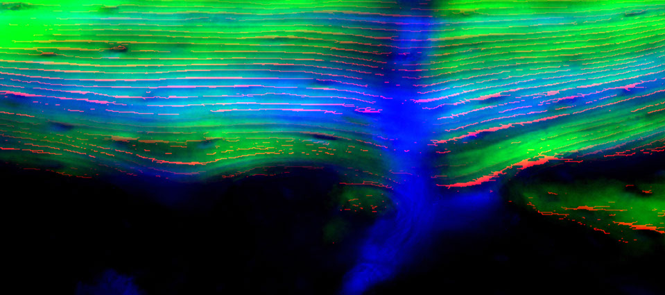 How do changes in gravity from earth to outer space affect bone growth? This image shows changes to the bone of a growing rat that spent time on the space shuttle. Each horizontal line represents small changes to the bone over a 24-hour period.