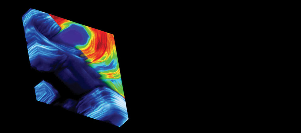 A microscopic view of the tooth surface of an African zebra. Black represents holes in the surface, yellow is the densest part of the tooth, and blue is the least dense section. Scientists study such images to better understand the effects of environmental change and disease on tooth and bone development.