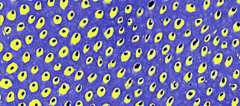 A microscopic view from a thigh bone of a three-million-year old early human. This image shows the bone cell spaces, corresponding to the the basic structural units of the bone. Comparing this image with images of bone from other early human species can help us to understand how humans have evolved over time.